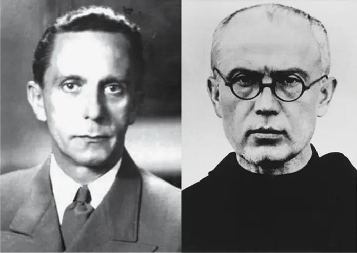 Ambos personajes murieron a causa del nazismo y sus cuerpos fueron incinerados, como para confirmar el versículo bíblico según el cual «una misma suerte toca a todos: al inocente y al culpable» (Ecl 9, 2). Pero en la otra vida, Kolbe fue recibido en los brazos de aquella en quien había depositado su confianza. Goebbels, en cambio, no podría salvarse a sí mismo.