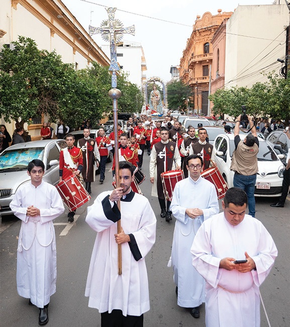 Paraguay – Con motivo del inicio de la novena a Nuestra Señora de la Asunción, patrona del país, los Heraldos animaron la procesión de traslado de la imagen, de dicha advocación, desde el Panteón Nacional de los Héroes hasta la catedral metropolitana, realizada el 6 de agosto (foto 1). El 26 de julio, miembros de la institución participaron en el 2.º congreso de catequesis de la diócesis de San Lorenzo, celebrado en el polideportivo de la ciudad (fotos 2 y 3).